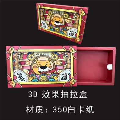 3D抽拉包装盒,材质选用了350克白卡,裱1500克白卡,共裱4层,纯手工打造,3D立体效果超㬱,也体现了客户的产品高贵,放便使用。在加上烫金,让包装盒更加精美…